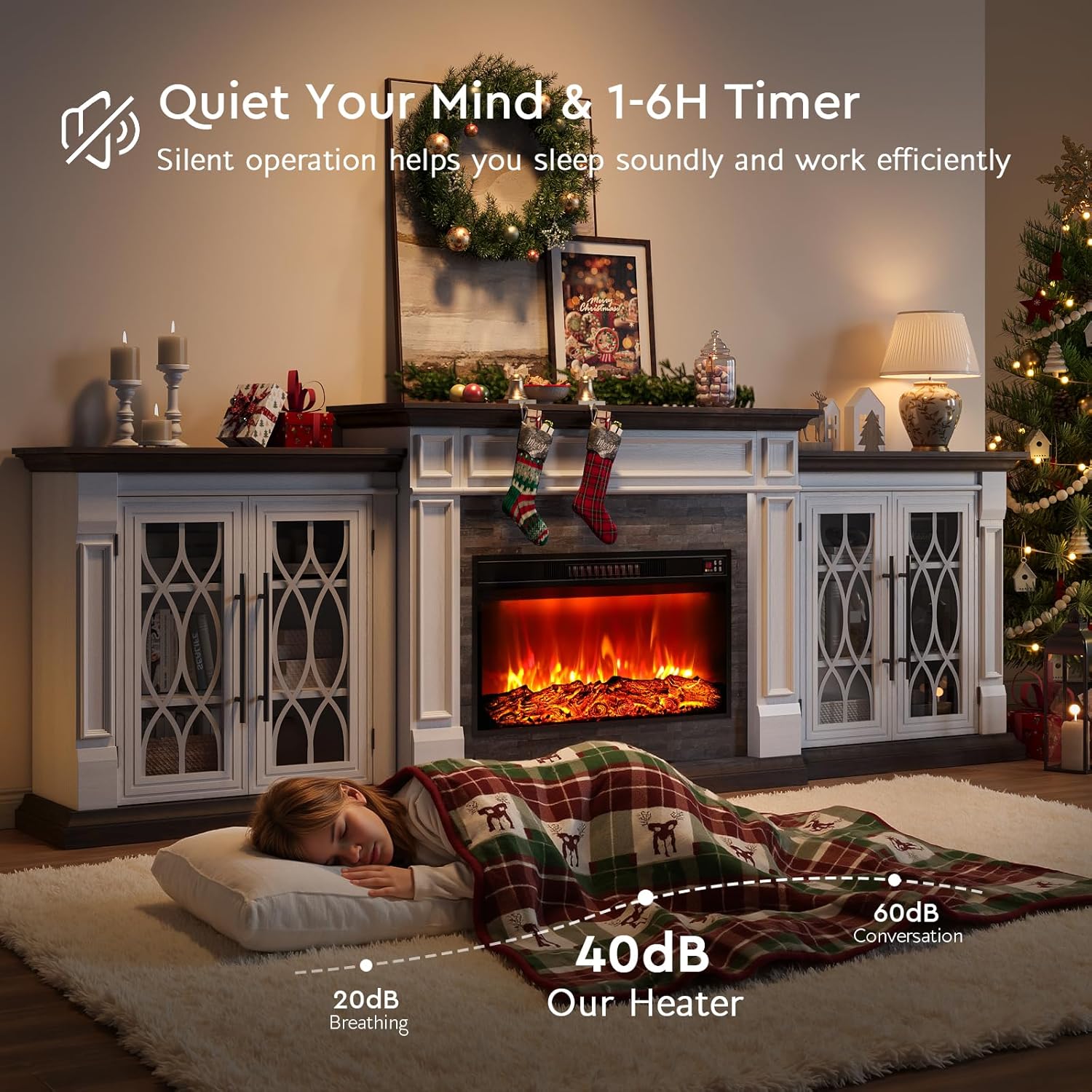 🔥【30'' Electric Fireplace with Efficient Heating】Experience warmth and comfort with our 30'' electric fireplace, equipped with a powerful 1400W heater that delivers 5,000 BTU. This efficient heating system effectively warms up to 400 square feet, ensuring a cozy environment in your home.