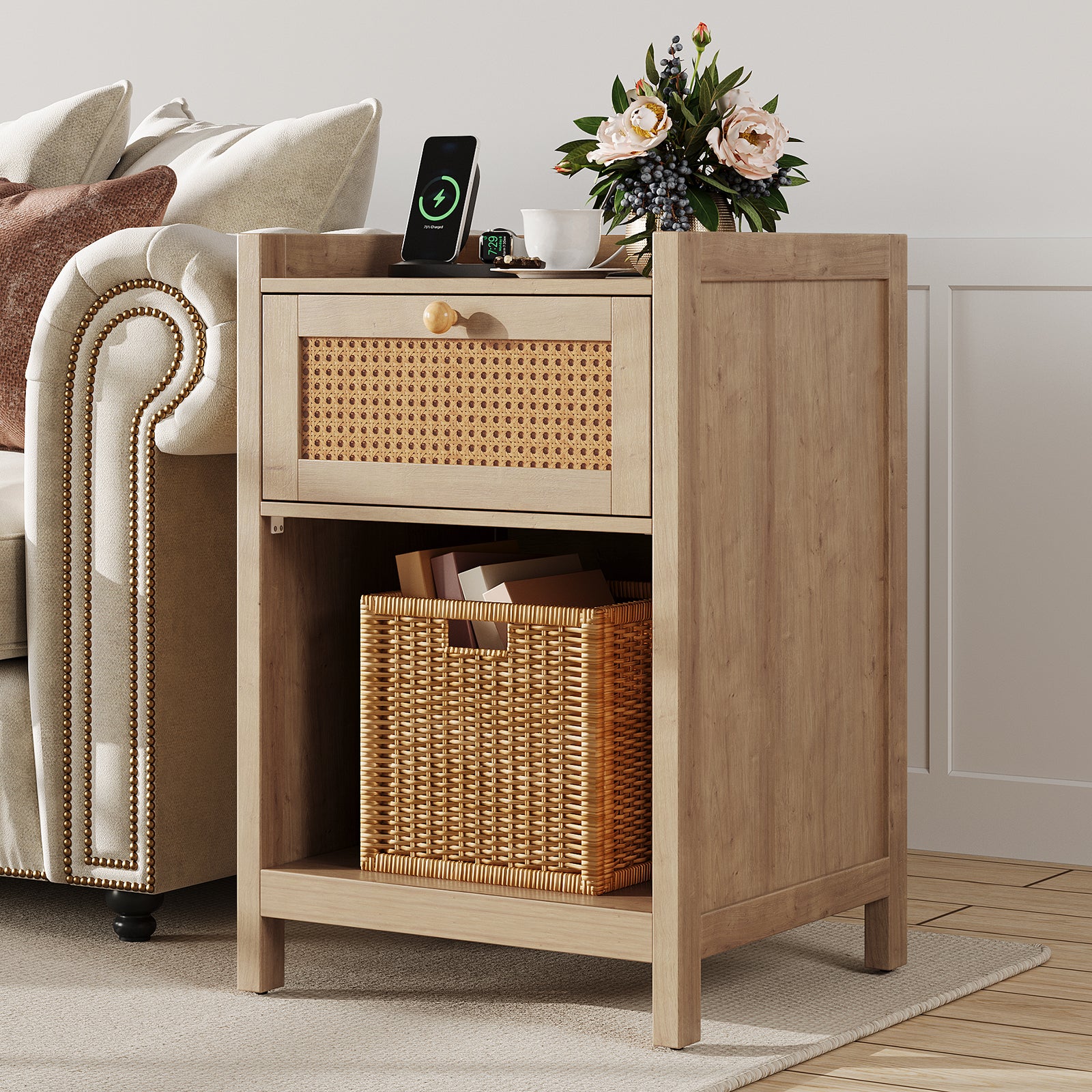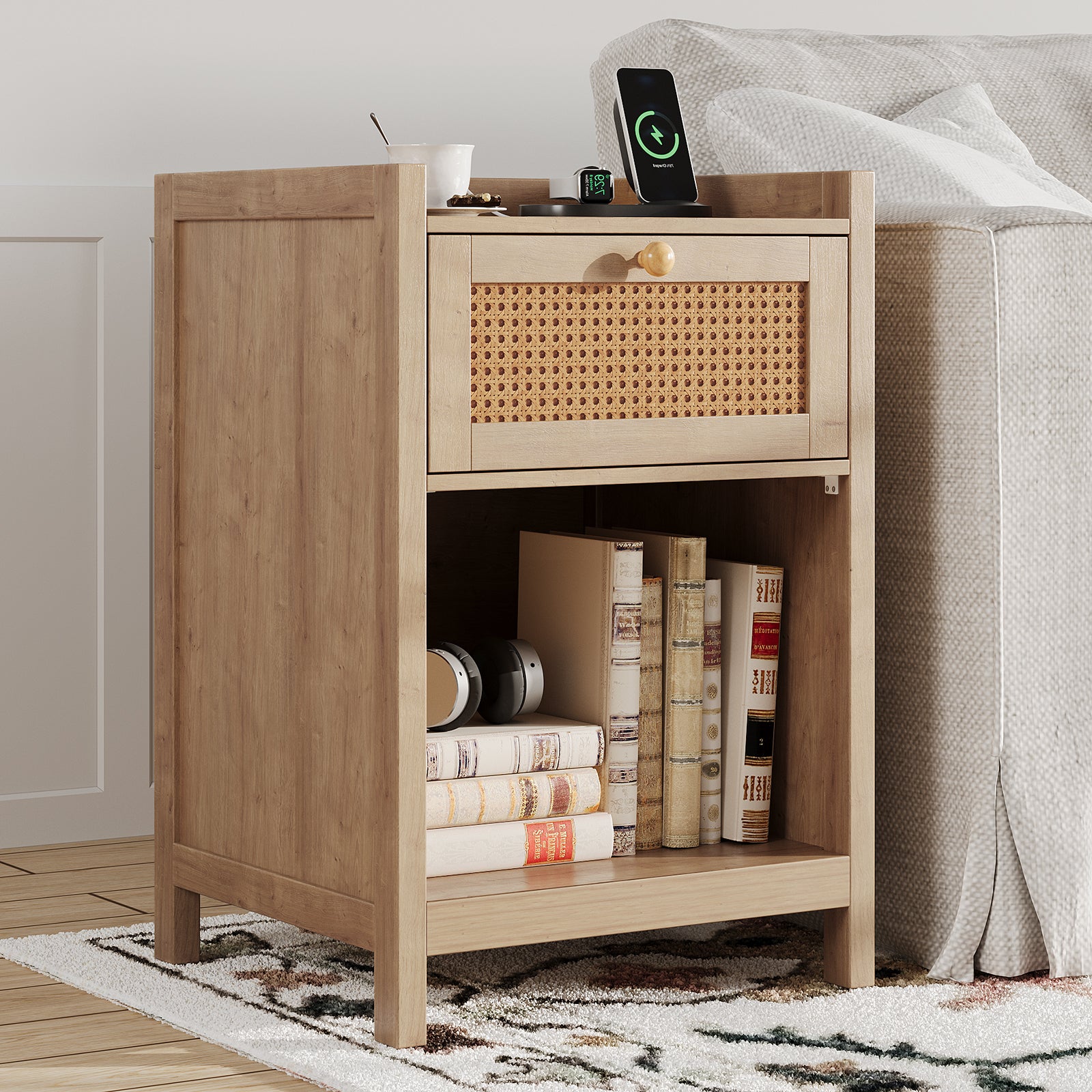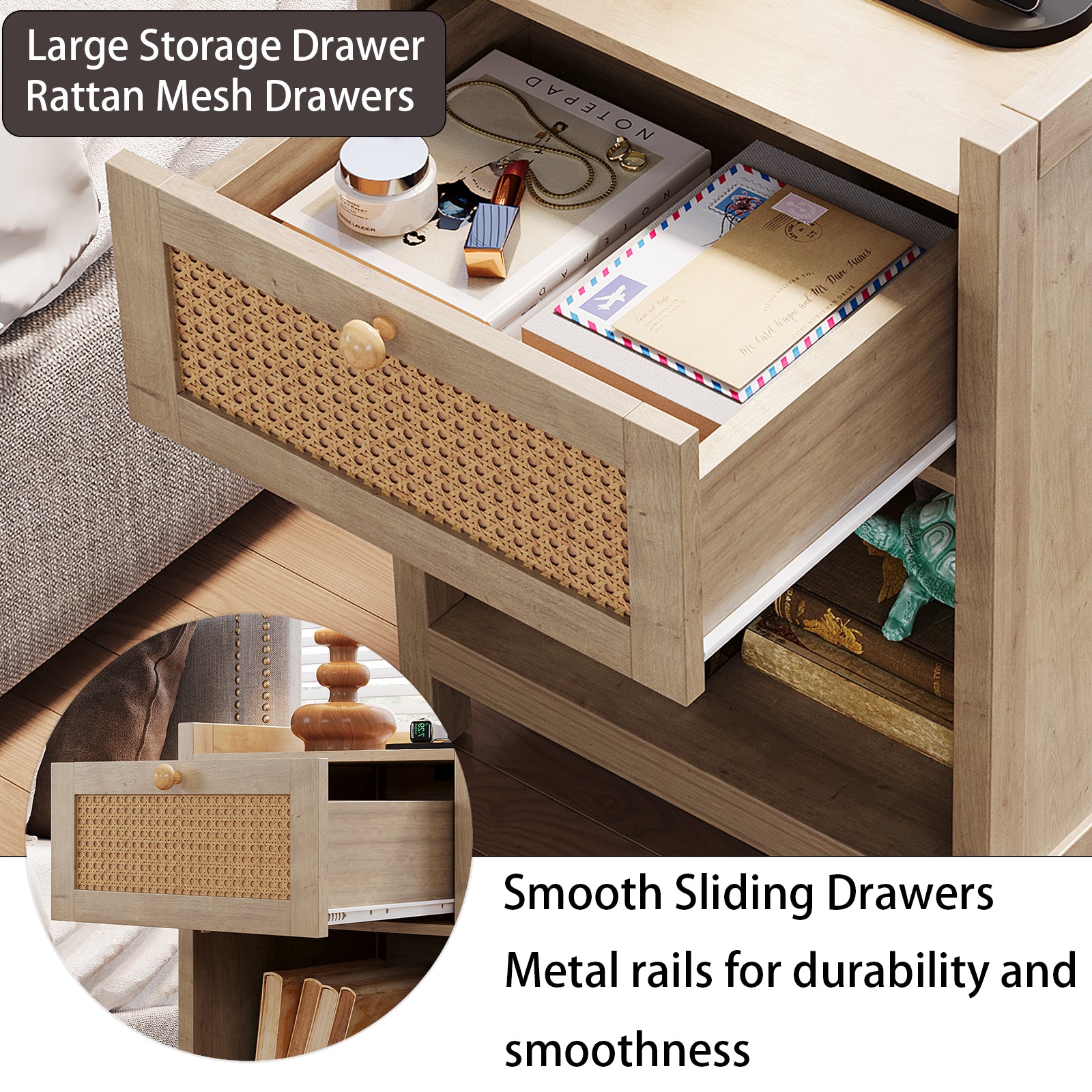 Go to the shopThe chest of drawers provides a comfortable height to place lamps, books, cell phones within arm’s reach. The drawer can glide out mostly, fits normally folded shirts into it, also you can stack jeans and socks, keep them neat and tidy. Rattan patterns made from plastic, not real rattan, there will be no worry about insects and molds.The combination of the drawer and open shelf ensures convenient and secure storage, allowing for easy access to items while keeping them safe from children and pets. Plus, with the built-in charging station, you can easily charge your devices overnight without having to worry about messy cords or tangled wires.This versatile bedside table is not only perfect as a bedside table in bedrooms but also serves as an ideal end table in living rooms.