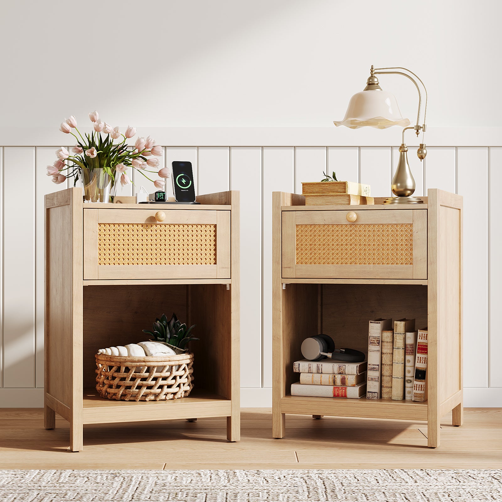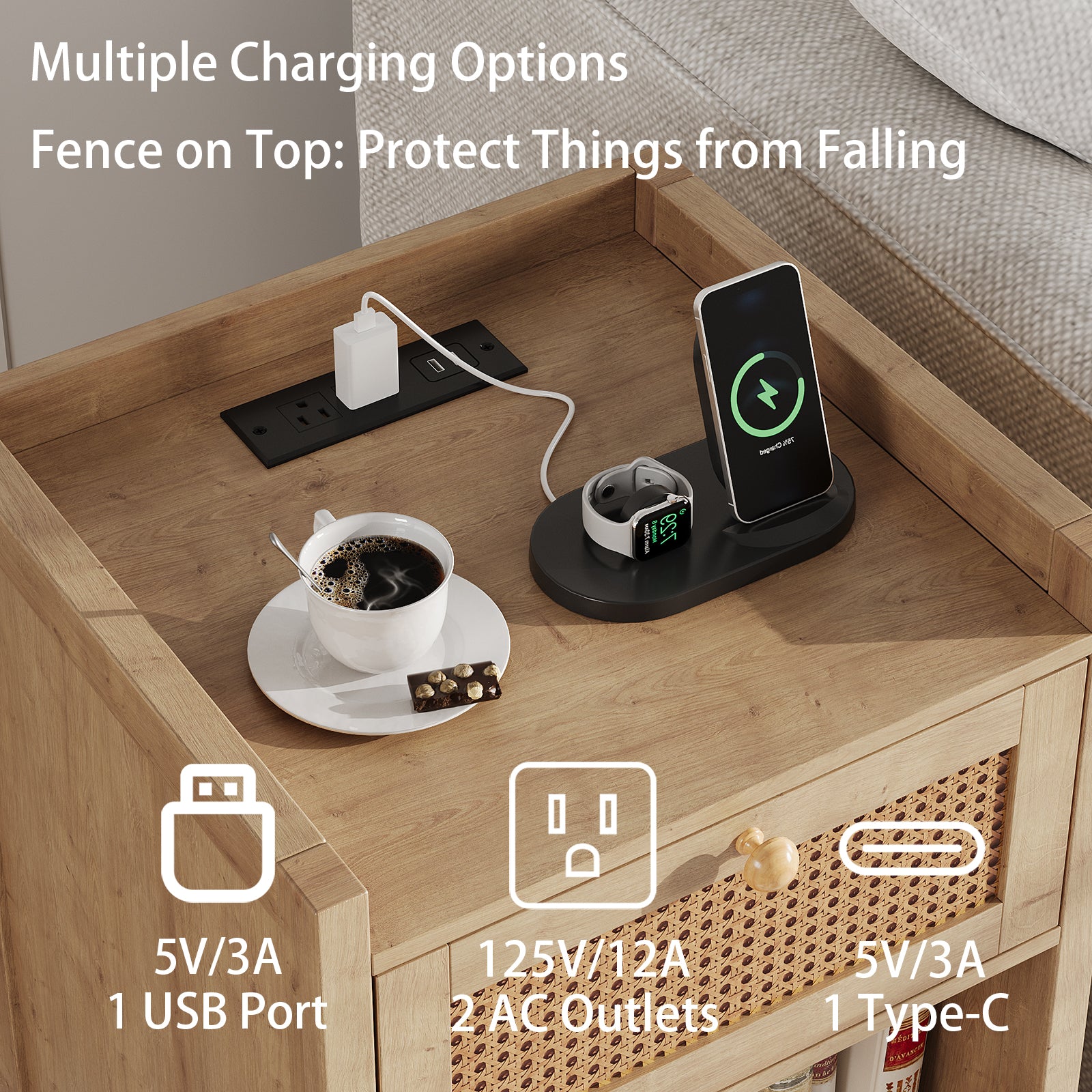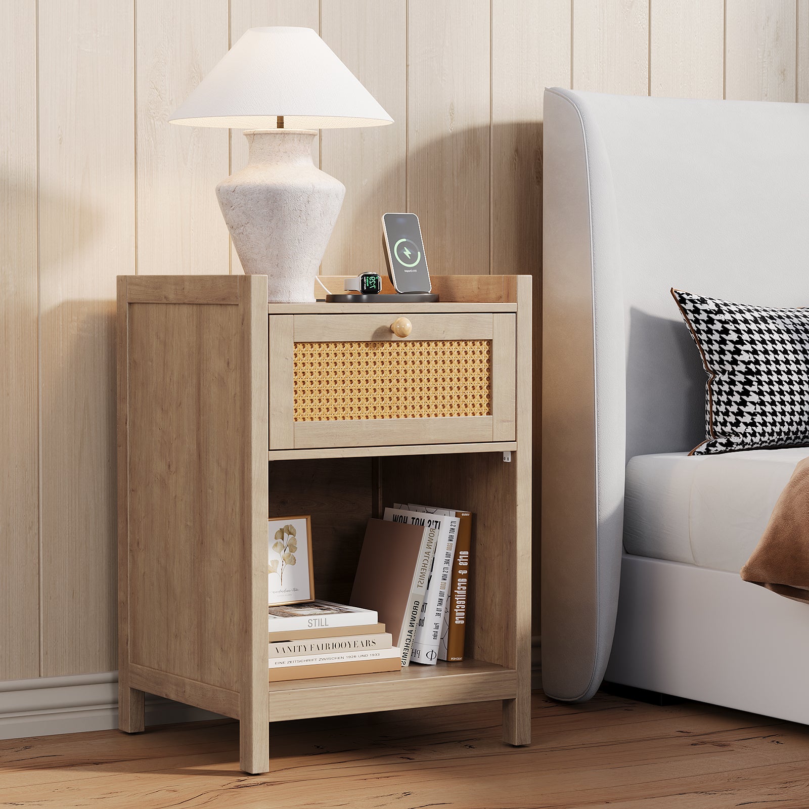 Go to the shopThe chest of drawers provides a comfortable height to place lamps, books, cell phones within arm’s reach. The drawer can glide out mostly, fits normally folded shirts into it, also you can stack jeans and socks, keep them neat and tidy. Rattan patterns made from plastic, not real rattan, there will be no worry about insects and molds.The combination of the drawer and open shelf ensures convenient and secure storage, allowing for easy access to items while keeping them safe from children and pets. Plus, with the built-in charging station, you can easily charge your devices overnight without having to worry about messy cords or tangled wires.This versatile bedside table is not only perfect as a bedside table in bedrooms but also serves as an ideal end table in living rooms.